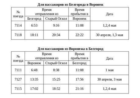 В связи с предстоящими выходными и праздничными днями скорректировано расписание движение поездов проекта «Соединяя Черноземье» по маршруту «Белгород – Старый Оскол – Воронеж». Об этом сообщили в региональном Минтрансе.