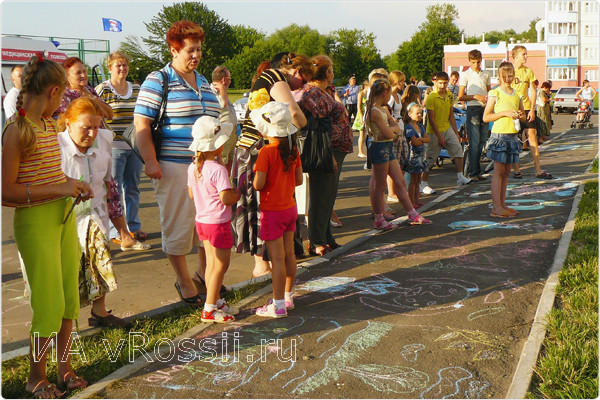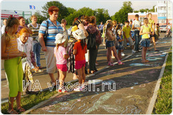Порадовали организаторы и "начинающих" художников – в программе был припасен конкурс детских рисунков на асфальте "Пусть всегда будет солнце". Ребятишки, не ограничиваясь заданной тематикой, изо всех сил старались изобразить так "чтоб не хуже, чем у других". Некоторые прибегали даже к помощи родителей, а изначальные сюжеты вытесняли цветочки и куколки.