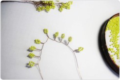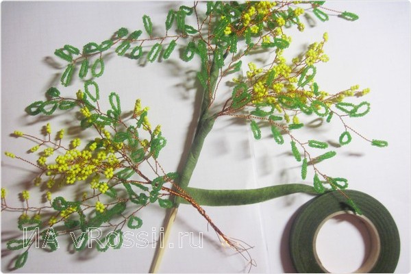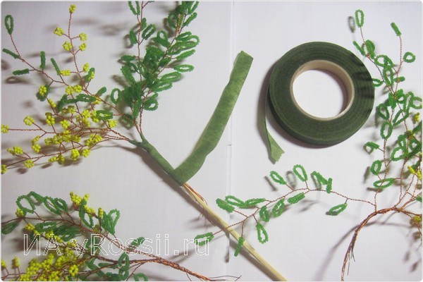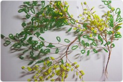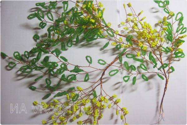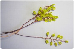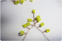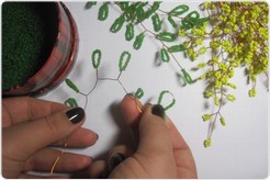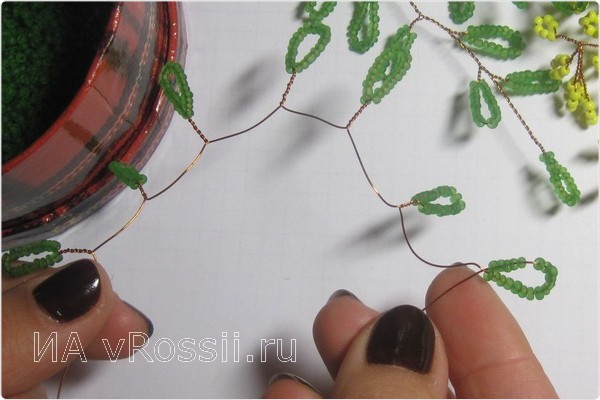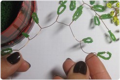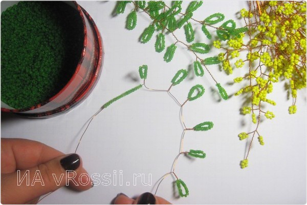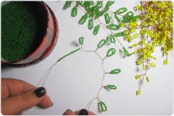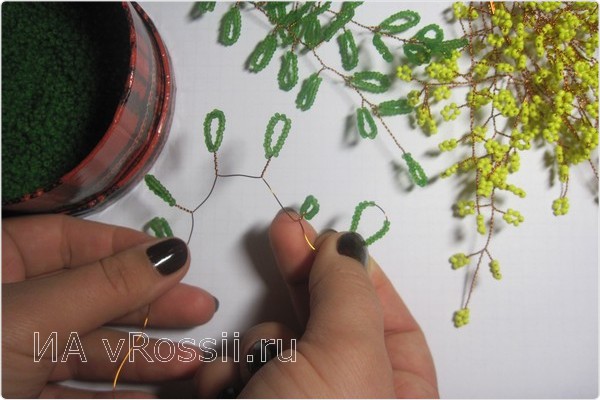 Как только изготовлено 15 желтых веток (их количество зависит только от вашего желания и усердия), переходим к плетению будущих листьев. Отрезок проволоки нужен немного длиннее — 60-70 см, ведь листья мимозы гораздо больше, чем "цветы". Для каждой петельки нанизываем около 20 бусинок бисера. Повторяем предыдущие действия — скручиваем веточки.