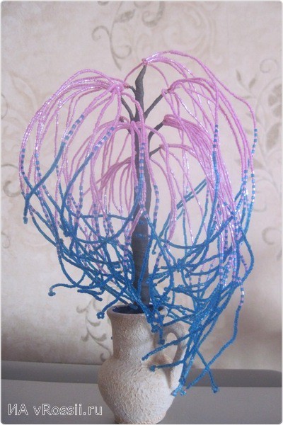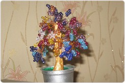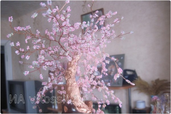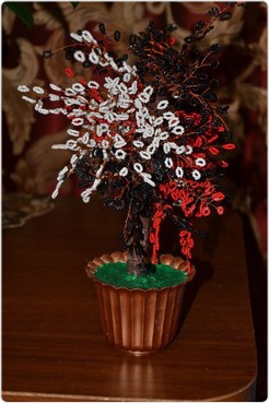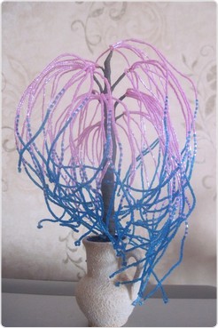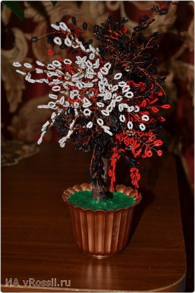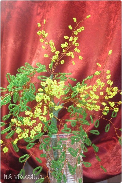 И вот наш результат! Мы сделали праздничную мимозу из бисера своими руками. Перевяжите веточку лентой и все готово, можно смело идти на праздник. Если есть желание, "посадите" мимозу в небольшую плошку и заполните основание гипсом — получится замечательно дерево. Вот несколько примеров:
