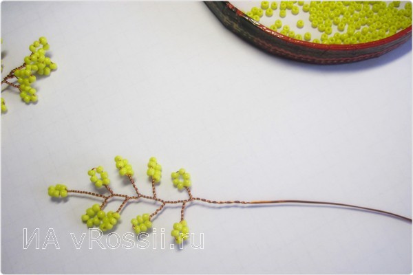 Необходимо подготовить медную проволоку — отрезки по 50 см каждый. Количество отрезков зависит от того, насколько пышной вы будите делать свою мимозу. Нанизываем на отрезок желтый бисер — 6 шт — и закрепляем его несколькими оборотами проволоки у основания. Повторяем эти действия до тех пор, пока отрезок проволоки не заполнится желтыми "петельками".