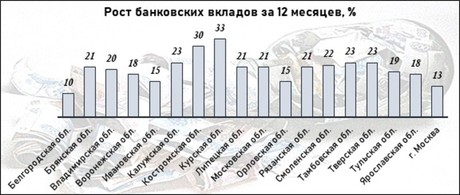 Больше всего объем средств населения увеличился в Костромской и Курской областях – на треть по сравнению с показателями в аналогичную дату прошлого года. Еще в девяти регионах размер сбережений подрос минимум на 20%. Белгородская область немного отстает от всех остальных. За год депозитная база подросла только на 10%. В прошлом году на Белгородчине объем вкладов подскочил сразу на 37 п.п. – с 321 до 439 млрд руб.
