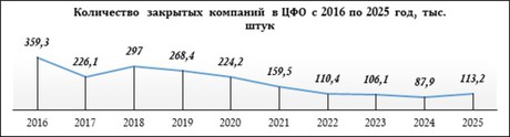 Наибольший вклад в общую негативную тенденцию внесла столица. В 2025 году закрылось 82,4 тыс. компаний против 55,8 тыс. в 2024 году. Т.е., за год число ликвидированных организаций в главном городе страны выросло на 26,6 тыс. или в 1,5 раза. Тогда как во всем Центральном округе общее количество бизнес-учреждений, прекративших работу, уменьшилось на 1,3 тыс. – 30,7 тыс. против 32 тыс.