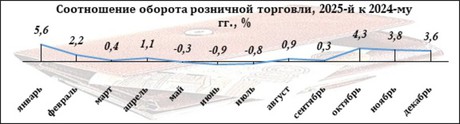 Только в начале и конце года предприниматели почувствовали интерес к покупкам со стороны конечного потребителя. Да и то рост в 2024-м году превосходил увеличение спроса в прошлом году. Например, в феврале 2024 г. оборот розничной торговли вырос на 12,8% против 2,2% в 2025 г. Или в ноябре прошлого года выручка от продажи увеличилась на 3,8%, а годом ранее этот показатель составлял 4,8%.