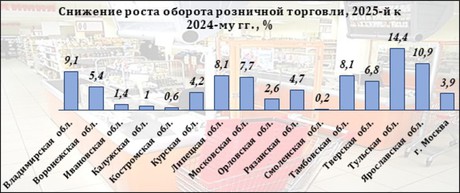 Лишь в двух регионах улучшились темпы увеличения выручки от продажи товаров. В Брянской области это плюс 0,6 процента (3,1% в 2025-м г. против 2,5% в 2024-м г.), в Белгородской области показатель чуть меньше – плюс 0,5% (4,2% против 3,7%).