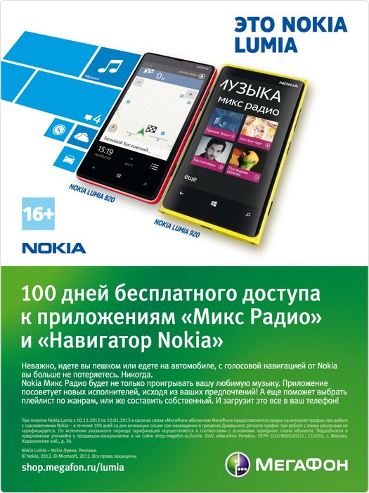 Все новости от МегаФонПриобретая смартфоны Nokia Lumia* в салонах "МегаФона" (ОАО "МегаФон Ритейл"), а также в интернет-магазине shop.megafon.ru, покупателей ждет новогодний подарок – 100 дней бесплатного интернет-трафика для приложений Nokia МиксРадио, Карты Nokia, Навигатор Nokia и Nokia Транспорт.