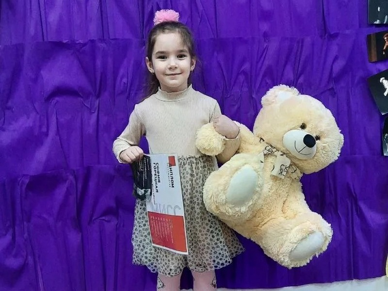 Маленькую красавицу мы пригласили в международную школу иностранных языков «Лингвист» в Воронеже. В качестве награды она получила подарочный сертификат от школы, а также классного  плюшевого медведя от нашего постоянного партнера конкурса из Брянска – магазина «Медвежья башня».