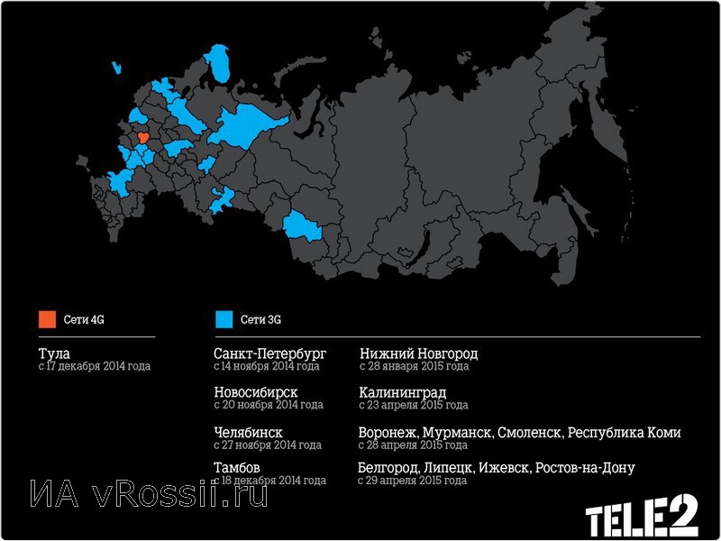 Tele2 запустила скоростной мобильный интернет в 16 регионах России. В настоящее время сеть 3G Tele2 доступна абонентам Санкт-Петербурга, Новосибирска, Челябинска, Тамбова, Нижнего Новгорода, Калининграда, Воронежа, Мурманска, Смоленска, Республики Коми, Ростова-на-Дону, Белгорода, Липецка, Ижевска и Вологды. Сеть 4G работает на территории Тулы.