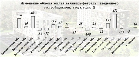 Замедление произошло в первую очередь из-за уменьшения объем ввода жилья, построенного населением. За первые два месяца темпы такого вида строительства сократились на 40,8% – до 2,9 млн квадратных метров. В январе активность жителей округа снизилась на 28,1% (1,7 млн кв. м), в феврале – на 52,7% (1,2 млн кв. м). За этот же период ввод жилья в многоквартирных домах даже немного подрос – на 7,9%. В январе-феврале застройщиками сдано 1,44 млн "квадратов". Это лучший результат за последние три года. В январе введено 683 тыс. кв. м (+21%), в феврале – 759 тыс. кв. м (–2%).