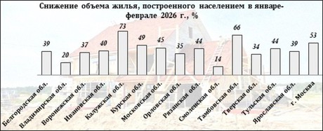 Худшая динамика по строительству жилья населением прослеживается в Калужской (–73%, с 210 до 56 тыс. кв. м), Тамбовской (–66%, с 76 до 26 тыс. кв. м) областях, а также в столице (–53%, со 181 до 85 тыс. кв. м).