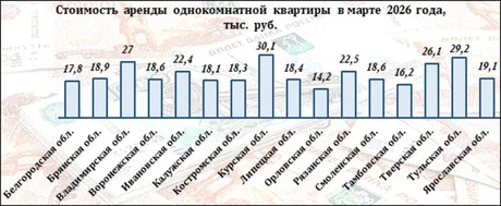 С начала 2026 года арендная плата выросла в большинстве регионов округа. Самые заметные изменения в большую сторону с января по март наблюдаются в Смоленской (+9,8% или 1,7 тыс.), Московской (+4,4% или 1,6 тыс.) и Тульской (+3,5% или 1 тыс.) областях. Противоположные тенденции, т.е. уменьшение арендной платы, характерны для столицы, Курской и Брянской областей. В этих регионах снижение составило 500-600 рублей.