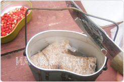 Итак, для обычной каши нам понадобится: армейский котелок, литр колодезной воды, две горсти гречки и банка тушенки. Соль и перец по вкусу. Доводим воду до кипения на костре, опускаем прямо в кипящую воду гречку. Лучше, если гречка будет специальная - для варки, в таких небольших мешочках. Пока гречка варится, можно еще раз искупаться в реке. По истечении 15 минут снимаем котелок с костра, сливаем воду, вытаскиваем мешочки с гречкой из котелка, споласкиваем его в речке. Вскрываем уже варёную гречку, высыпаем в уже чистый котел. Осторожно, может быть горячо! Далее - тушенка. Консервную банку лучше открывать ножом, никаких открывалок - так вкуснее. Прямо в банке тушенку нужно мелко-мелко порубить тем же ножом. Далее - необходимо выложить тушенку в котёл с гречкой. И тщательно перемешать. Каша пока еще слишком горячая для употребления в пищу, поэтому необходимо дать её остыть. Выкурив сигарету, можно приступать к трапезе. Вкуснее всего такую кашу есть, обжигаясь, прямо из котелка большой-пребольшой ложкой.