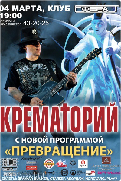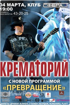 С 1 по 3 марта на Орловском городском портале vOrle.ru будет идти викторина, победитель которой получат 2 билета на концерт группы "Крематорий". Для этого необходимо всего лишь правильно и быстрее всех ответить на вопросы викторины. Тот счастливчик, который успеет сделать это первым, получит прекрасную возможность насладиться творчеством Армена Григоряна (музыка, тексты, гитара, вокал), Максима Гусельщикова (скрипка,клавиши), Владимира Бурхеля (гитара), Николая Коршунова (бас), Андрея Ермолы (ударные) и бессменного звукорежиссера группы Сергея Овсянникова.