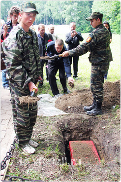 После минуты молчания останки младшего лейтенанта Алексея Георгиевича Грекова были преданы земле сотрудниками поисковых отрядов.
