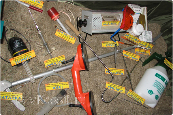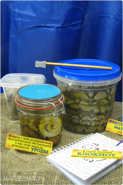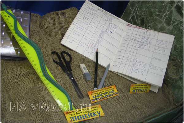 Мастер-классы, принять участие в которых может каждый желающий, будут проходить всего две недели и только по выходным – 4-5 и 11-12 июня с 12:00 до 16:00. Сама же выставка научных приборов и исследовательских приспособлений – до сентября. На экспозиции представлен весь базовый инструментарий научного сотрудника экзотариума – все самое необходимое для работы. Здесь и крючок для пересадки ядовитых змей, и УФ-лампы для создания нужной температуры в террариуме, и ядоотсос на несчастный случай укуса. А также микроскоп, водонагреватель, инкубатор для змеиных яиц, отсадники для содержания новорожденных и подросших змей и приспособления для выращивания живых «кормов» - грызунов. В общем – весь арсенал приборов для научно-исследовательской работы.