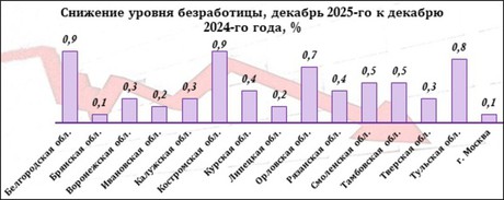 По сравнению с декабрем 2024-го года уровень безработицы уменьшился в большинстве регионов. Самые весомые отличия регистрируются в трех субъектах – Белгородской и Костромской (по –0,9%), а также в Тульской (–0,8%) областях. А еще в трех субъектах безработица либо не изменилась вовсе, как во Владимирской области, либо снизилась на 0,1%. Это характерно для столицы и Брянской области.